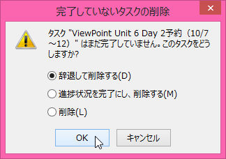 依頼された未完了タスクをリストから削除した場合、以下の[完了していないタスクの削除]メッセージが表示されます。タスクを辞退する場合は[タスクを辞退して削除する]を選択、タスクが完了しているのであれば[進捗状況を完了にし、削除する]を選択して[OK]ボタンをクリックします。[削除]を選択して[OK]ボタンを押すのは、依頼者が事情や状況が分かっている場合のみ選択してください。