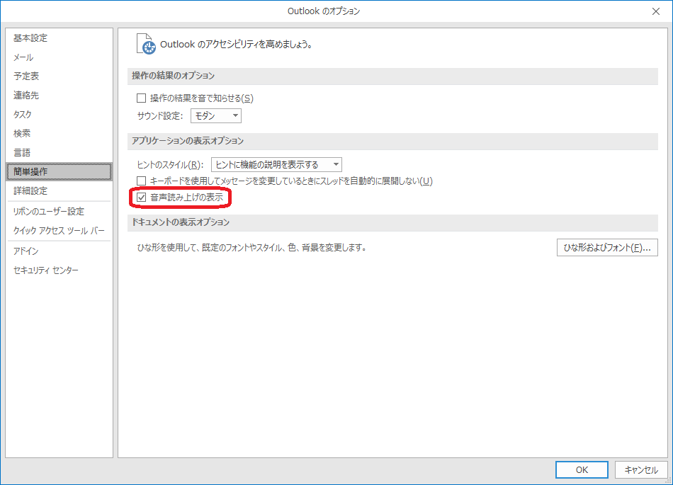 なお、この音声読み上げ機能を無効にするには、[Outlookのオプション]の[簡単操作]を開き、[アプリケーションの表示オプション]の[音声読み上げの表示]のチェックを外すとOKです。