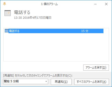 Outlook 2016でアラームが設定されたアイテムがある場合、その時間になるとアラームウィンドウが表示されます。再通知するか、あるいはアラームを消す方法について説明します。