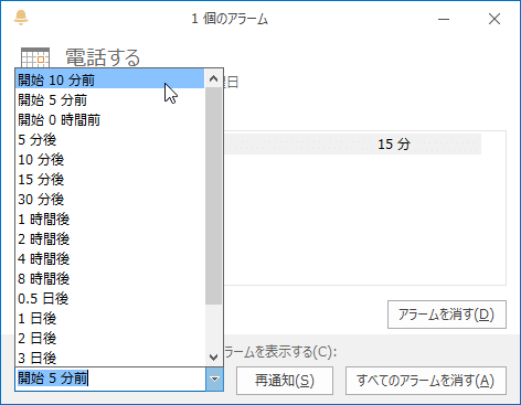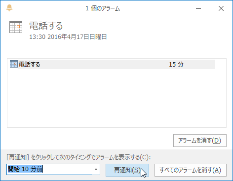 - アラームウィンドウが表示されたら、再通知のタイミングを一覧から選択します。