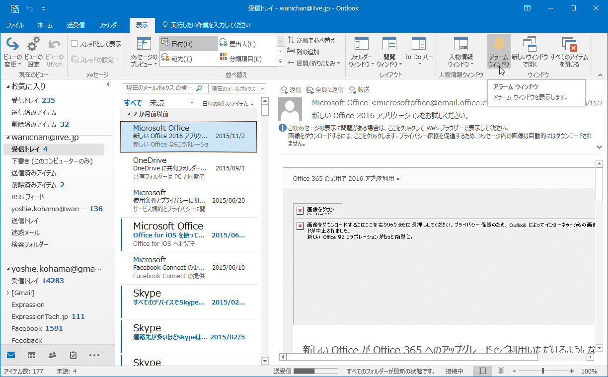 このアラームウィンドウを閉じたとしても、[表示]タブの[アラームウィンドウ]をクリックすることで、再表示できます。