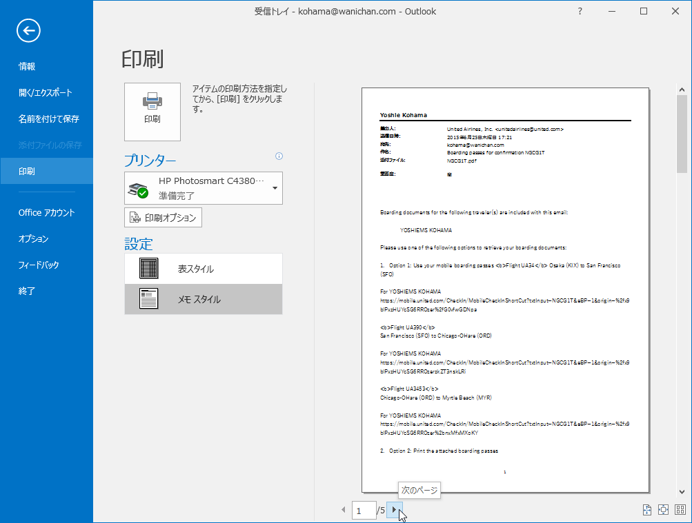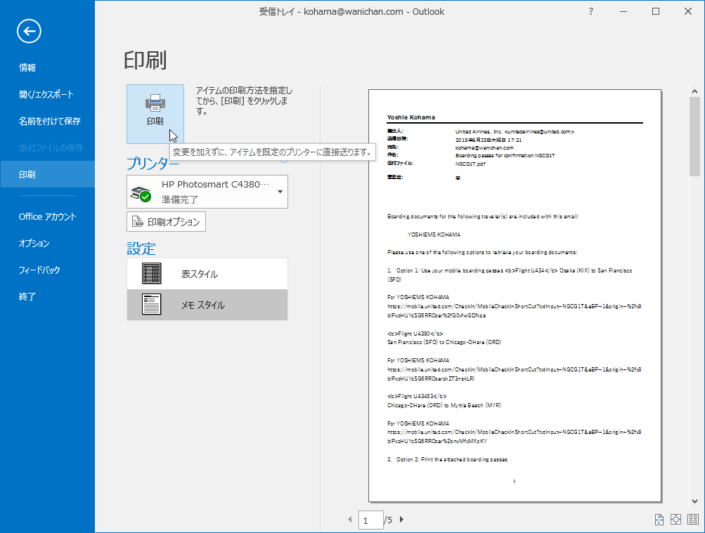 なお、メールの内容を印刷する場合は[メモスタイル]、メールアイテムの一覧の場合は[表スタイル]を選択します。ここでは[メモスタイル]のままでOKです。