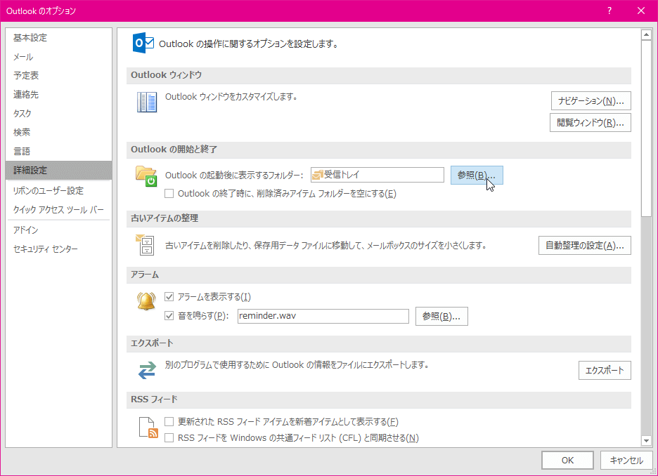 - [Outlookの開始と終了]グループの[Outlookの起動後に表示するフォルダー]の[参照]ボタンをクリックします。