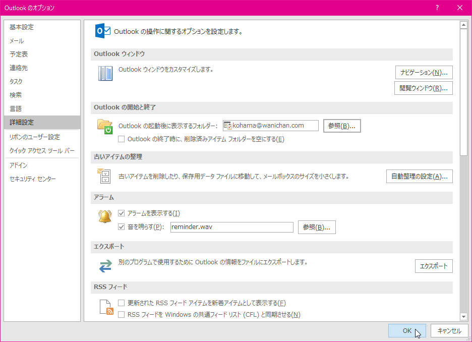 - [Outlookのオプション]ダイアログボックスの[OK]ボタンをクリックします。