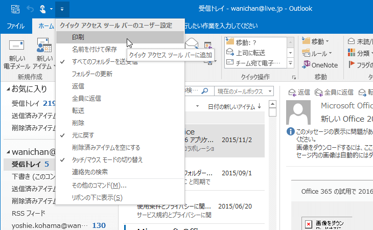 Outlook 2016でのタッチパネル対応のパソコンの初期設定では、[すべてのフォルダーを送受信][元に戻す][タッチ/マウス モードの切り替え]の3つのボタンが表示されています。この他に、よく使われるコマンドを簡単に追加することができます。[クイックアクセスツールバーのユーザー設定]をクリックして、追加したいコマンドを選択します。
