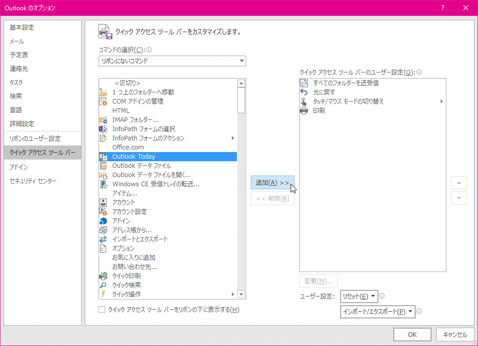 - [Outlookのオプション]ダイアログボックスの[クイックアクセスツールバー]タブが開くので、[コマンドの選択]一覧から追加したいコマンドを選択します。ここでは、[リボンにないコマンド]から[Outlook Today]を選択して[追加]ボタンをクリックします。