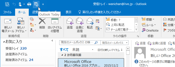 [Outlook Today]をクイックアクセスツールバーに追加する
