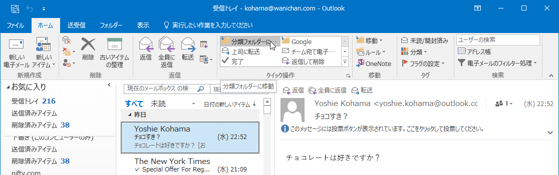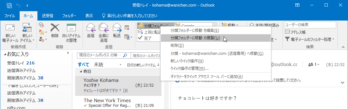 Outlook 2016でクイック操作コマンドをコピーするには、対象となるコマンドを右クリックして、ショートカットメニューより[○○ の複製]を選択します。