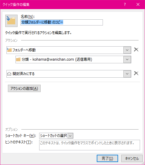 - そのクイック操作のコピーのコマンドの作成画面が表示されるので、適宜編集して[完了]ボタンをクリックします。