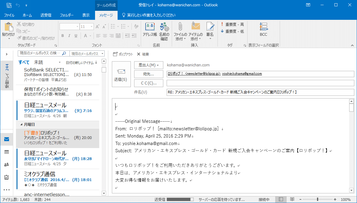 - [ホーム]タブの[返信]グループの[全員に返信]をクリックします。