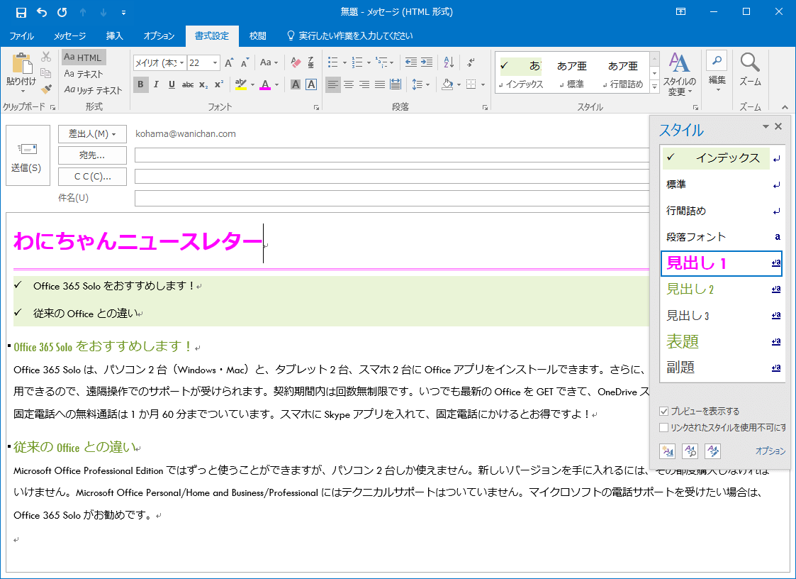 Outlook 2016で本文テキスト上にスタイルを直接変更して、スタイル一覧からスタイルを更新することができます。たとえば、見出しっぽいスタイルを視覚的に見出しのようにスタイルを適用したあとに、そのスタイルの箇所を選択して、スタイル一覧から見出しスタイルを右クリックして選択個所を一致するようにスタイルを更新することで、後でスタイルを整えることができます。