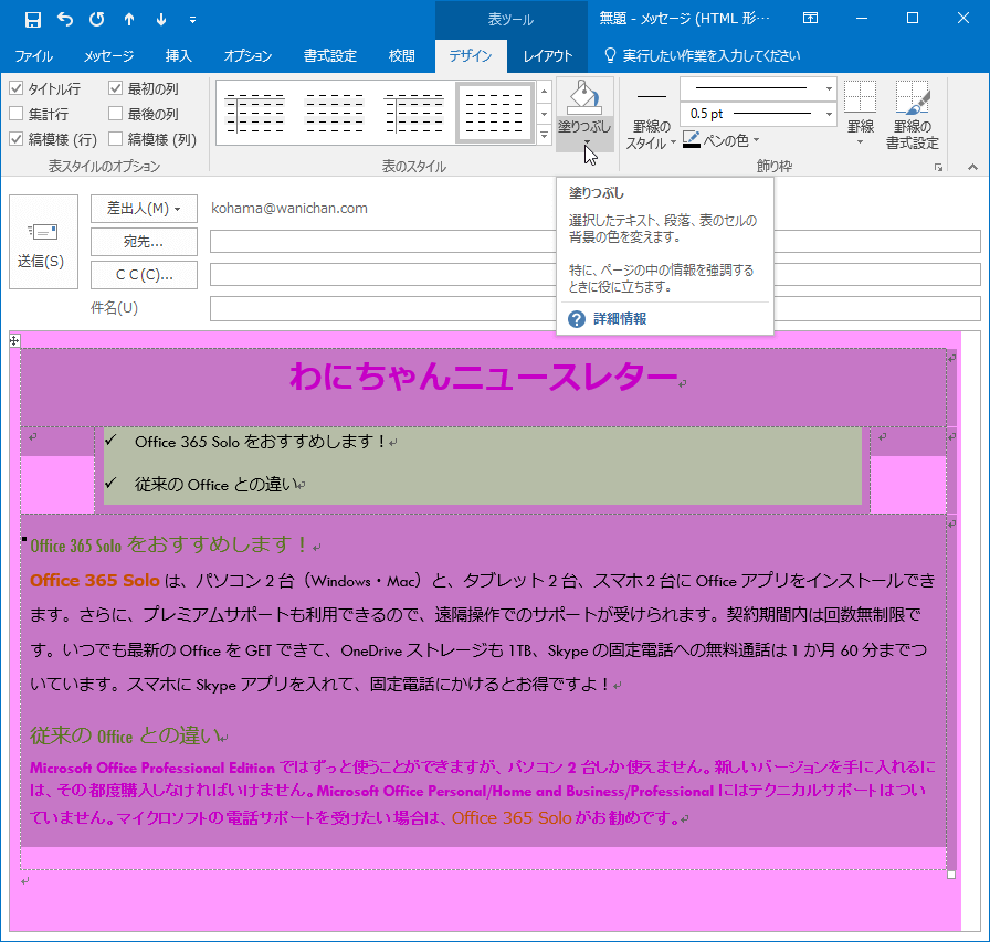 Outlook 2016でHTMLメールの全体の背景色を変更した後、レイアウト枠として挿入された表全体または一部のセルの背景色を変更するには、対象となる表全体またはセルを選択して[表ツール]の[デザイン]タブを開き、[塗りつぶし]一覧より選択します。
