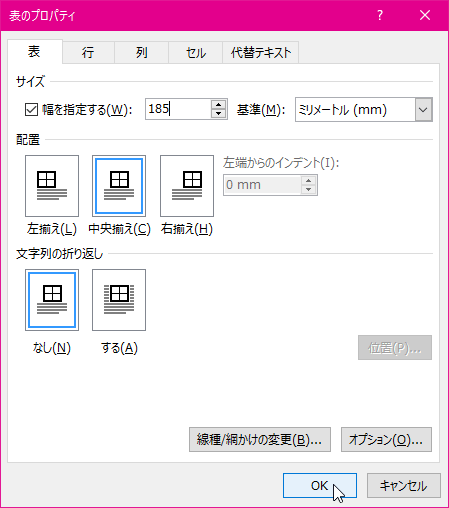 [表のプロパティ]ダイアログボックスの[表]タブにて[幅を指定する]にチェックを付けて幅を指定し、[OK]ボタンをクリックします。
