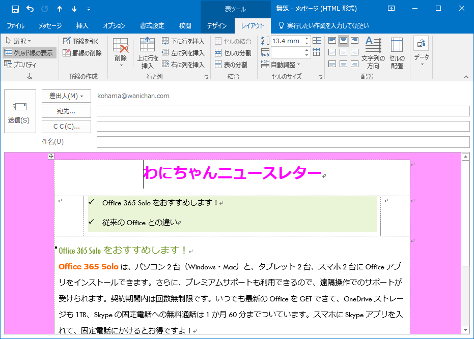 Outlook 2016で表内にカーソルを移動して[表ツール]の[レイアウト]タブを開いて、[表]グループの[プロパティ]をクリックし、[表のプロパティ]ダイアログボックスの[表]タブにて[幅を指定する]にチェックを付けて幅を指定します。