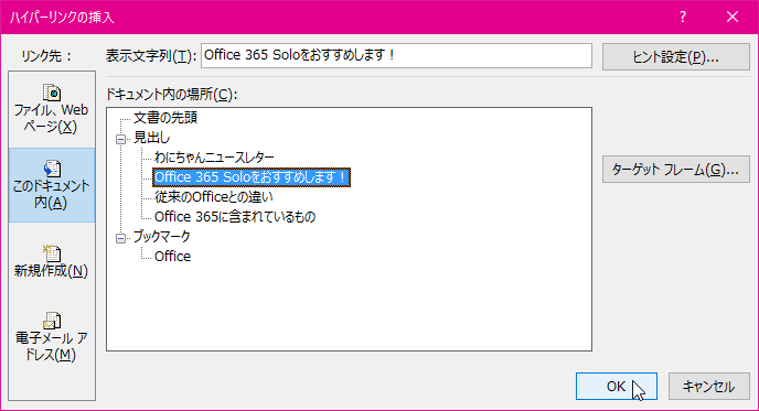 - 目的のリンク先の見出しを選択して[OK]ボタンをクリックします。