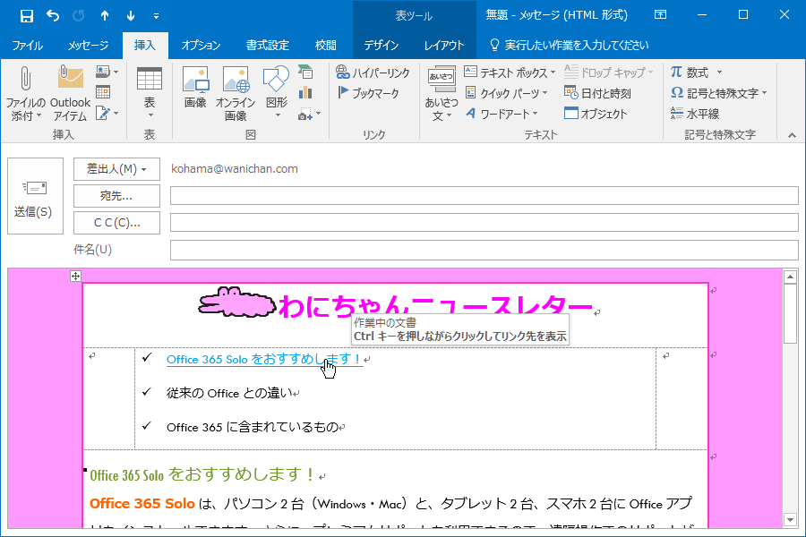 それぞれの見出しを見出しスタイルにすると、それぞれの見出しへのリンクを簡単に設定できます。Outlook 2016でニュースレターなどを作成するときは、それぞれの見出しに見出しスタイルを適用しておきましょう。対象となる文字列を選択して[挿入]タブを開き、[リンク]グループの[ハイパーリンク]をクリックして、[ハイパーリンクの挿入]ダイアログボックスの[このドキュメント内]一覧より、目的のリンク先の見出しを選択します。