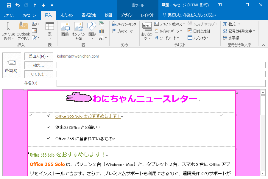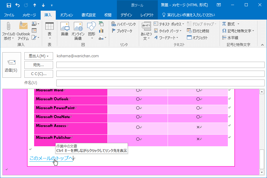 Outlook 2016で対象となる文字列を選択して[挿入]タブを開き、[リンク]グループの[ハイパーリンク]をクリックして、[ハイパーリンクの挿入]ダイアログボックスの[このドキュメント内]一覧より[文書の先頭]を選択します。