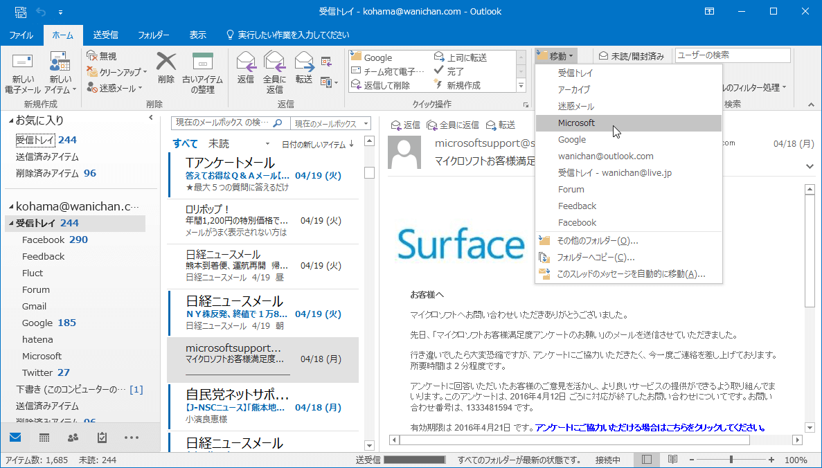Outlook 2016で選択したメールメッセージを別のフォルダーに移動するには、[ホーム]タブの[移動]グループの[移動]を選択して、移動先フォルダーを選択します。