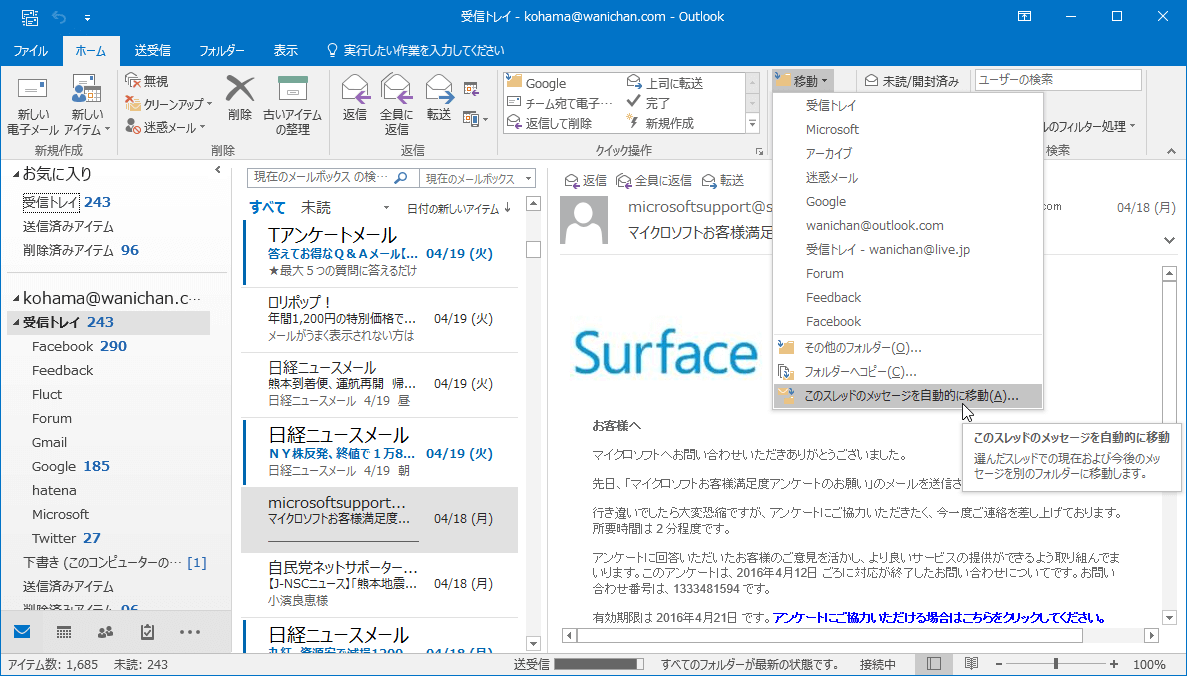 Outlook 2016で選んだスレッドで現在および今後のメッセージを別のフォルダーに移動するには、[ホーム]タブの[移動]グループの[移動]を選択して、[このスレッドを自動的に移動]を選択し、移動先を指定します。