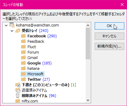 - [スレッドの移動]ダイアログボックスで移動先フォルダーを選択して[OK]ボタンをクリックします。