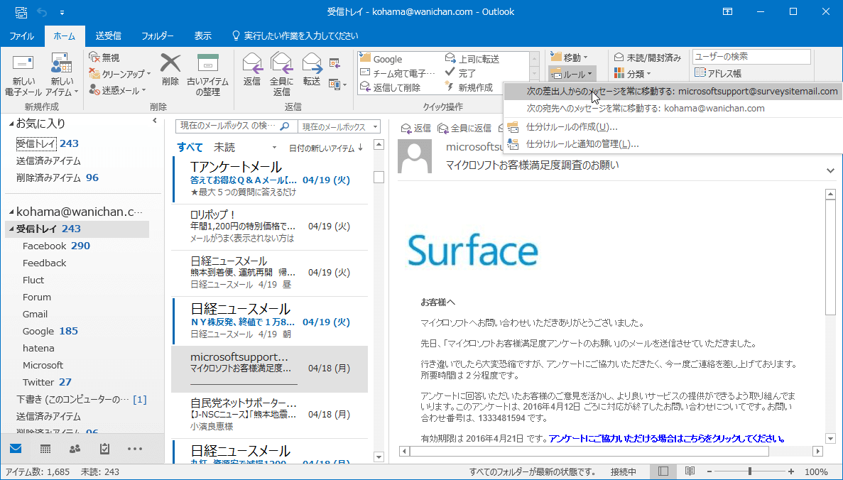 - 一覧から[次の差出人からのメッセージを常に移動する]を選択します。