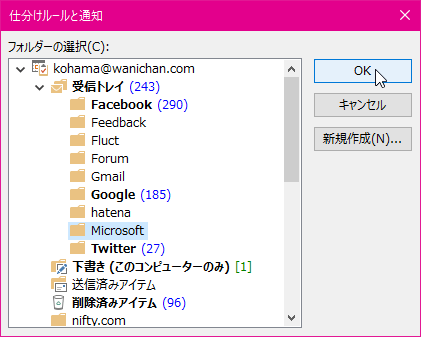 - [仕分けルールと通知]ダイアログボックスで移動先フォルダーを選択して[OK]ボタンをクリックします。