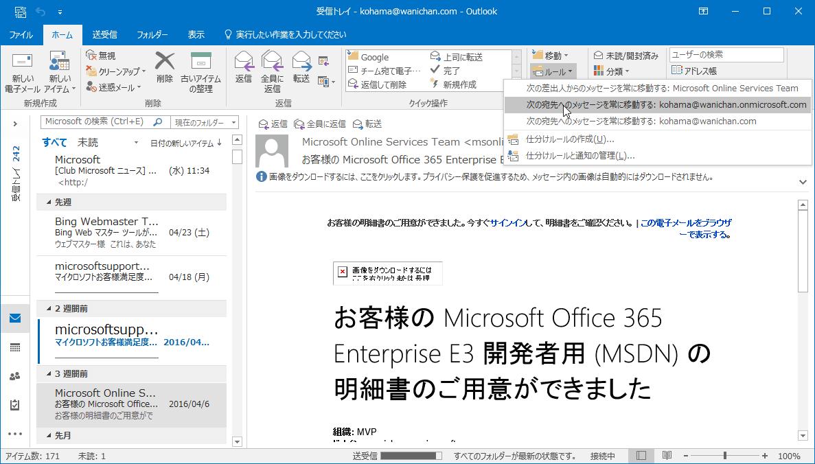 Outlook 2016で選択したメッセージの宛先を基にルールを作成し、メールが常に別のフォルダーに移動されるようにするには、[ホーム]タブの[移動]グループの[ルール]をクリックして、[次の宛先からのメッセージを常に移動する]を選択し、[仕分けツールと通知]ダイアログボックスで移動先フォルダーを指定します。宛先やCCが複数含まれている場合のみに有効です。