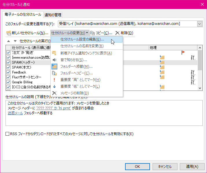 - [仕分けルールと通知]ダイアログボックスで、変更したいルールを選択し、[仕分けルールの変更]をクリックして[仕分けルール設定の編集]をクリックします。
