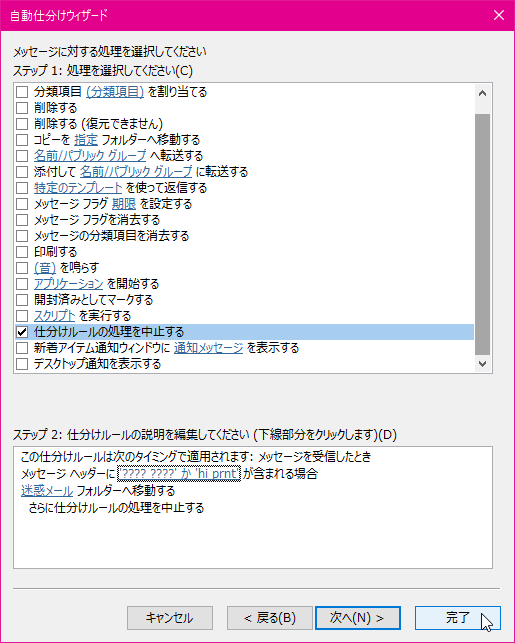 - 自動仕分けウィザードが表示されたら、ルールを編集して、[完了]ボタンをクリックします。