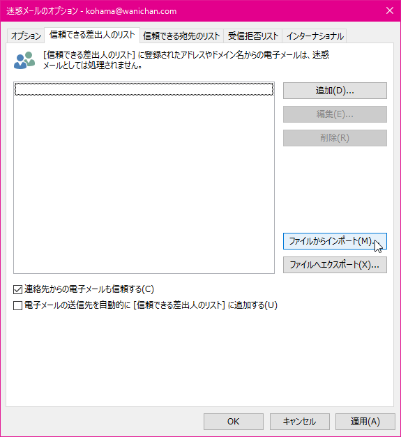 - [迷惑メールのオプション]ダイアログボックスの[信頼できる差出人のリスト]タブを開きます。