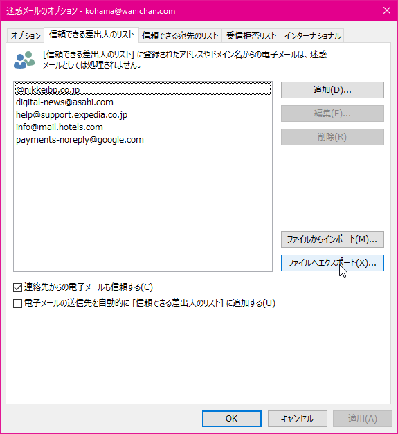 信頼できる差出人のリストをエクスポートする