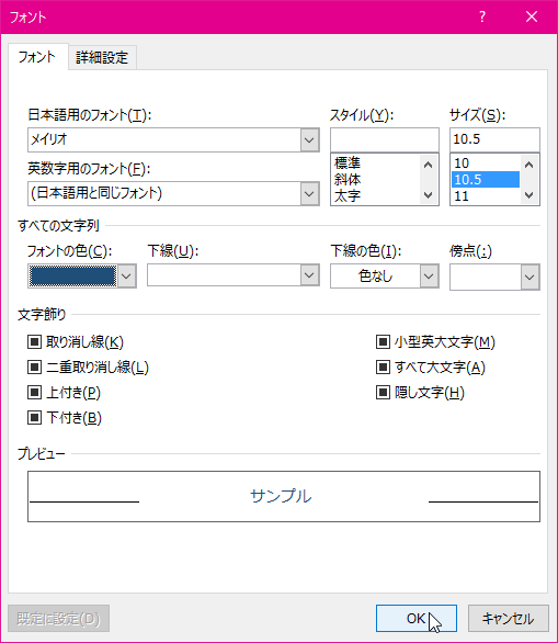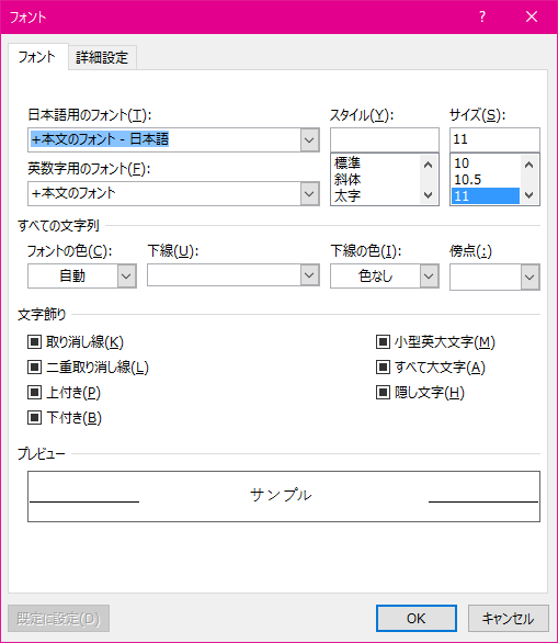 - [フォント]ダイアログボックスで、フォントやフォントサイズを調整して[OK]ボタンをクリックします。