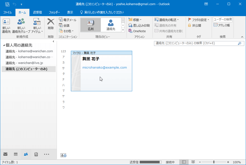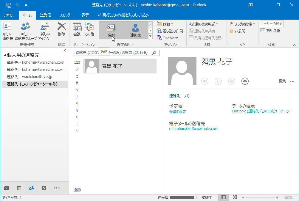 - [ホーム]タブの[現在のビュー]から[名刺]に切り替えます。
