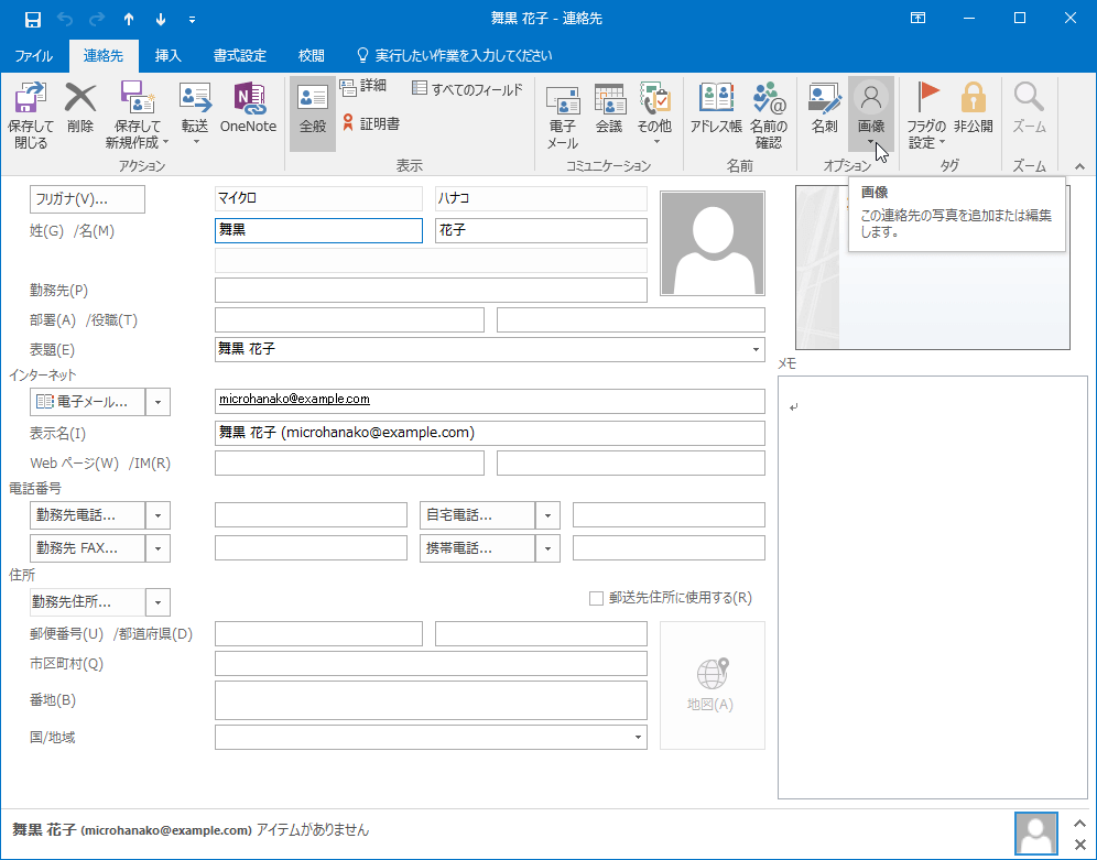 従来のフォームで開きました。そこで[連絡先]タブの[オプション]グループの[画像]をクリックします。