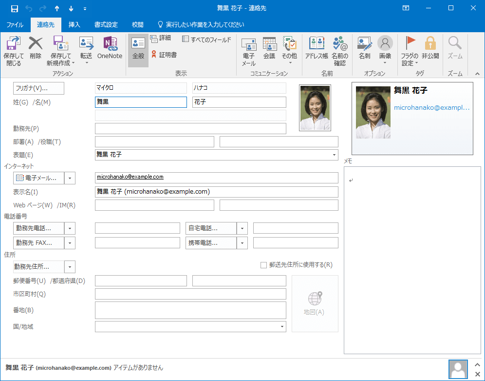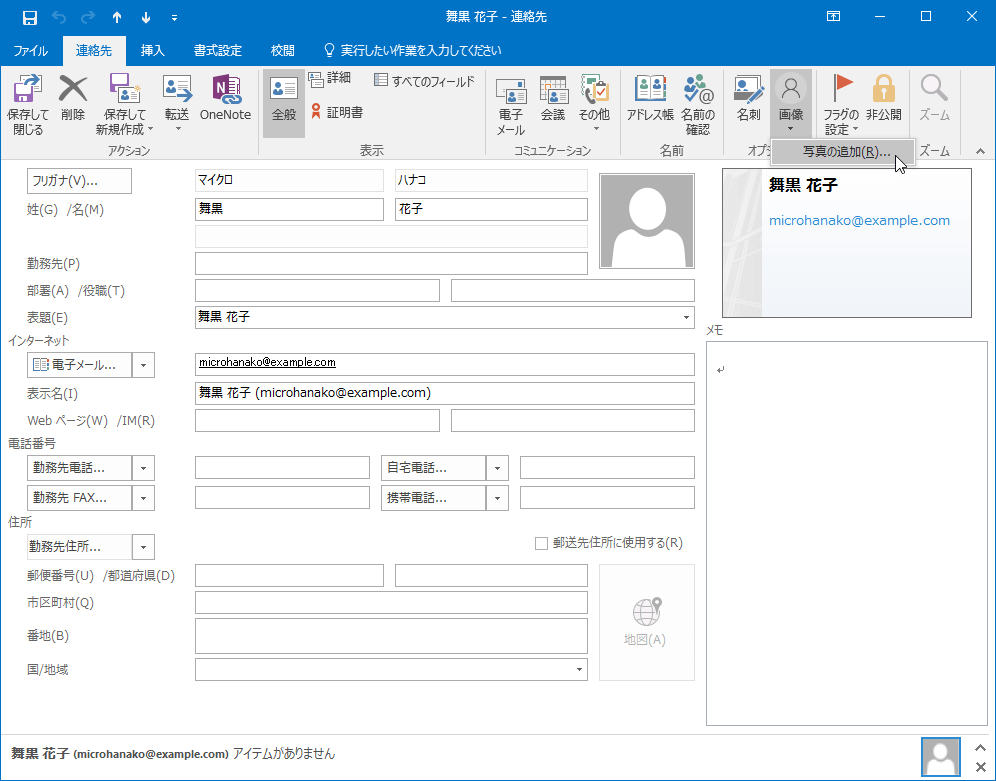 Outlook 2016で[ホーム]タブの[現在のビュー]から[名刺]に切り替えて、編集したい連絡先をダブルクリックすると、従来のフォームで編集でき、写真を追加できます。