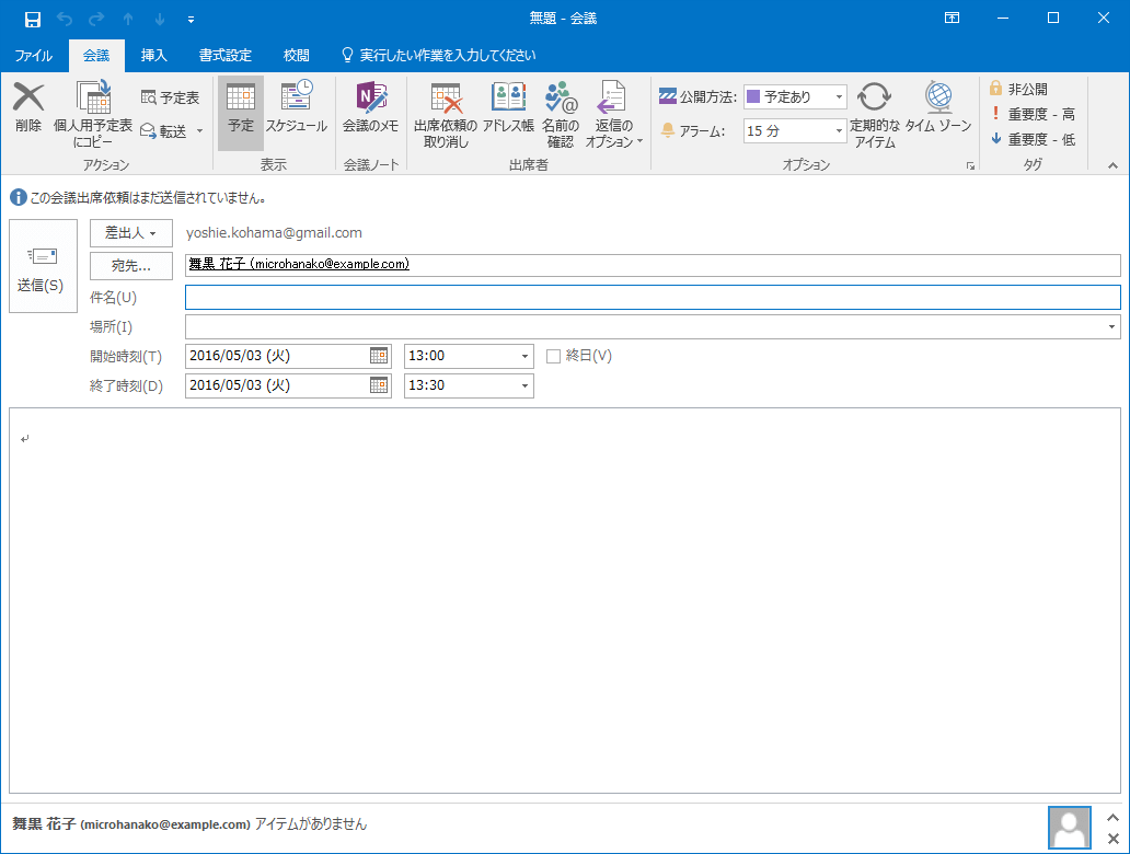 - 選択した連絡先宛ての新しい会議ウィンドウが開いたら、件名、場所、会議時間、詳細を入力し、[送信]ボタンをクリックします。