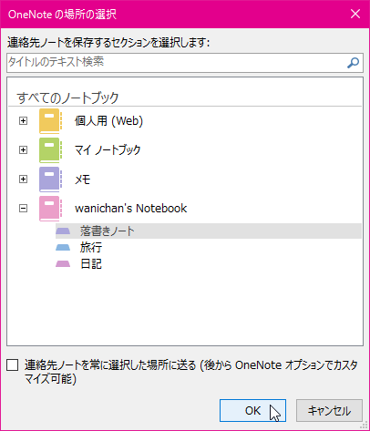 [OneNoteの場所の選択]ダイアログボックスが表示されたら、連絡先ノートを保存するセクションを選択して[OK]ボタンをクリックします。