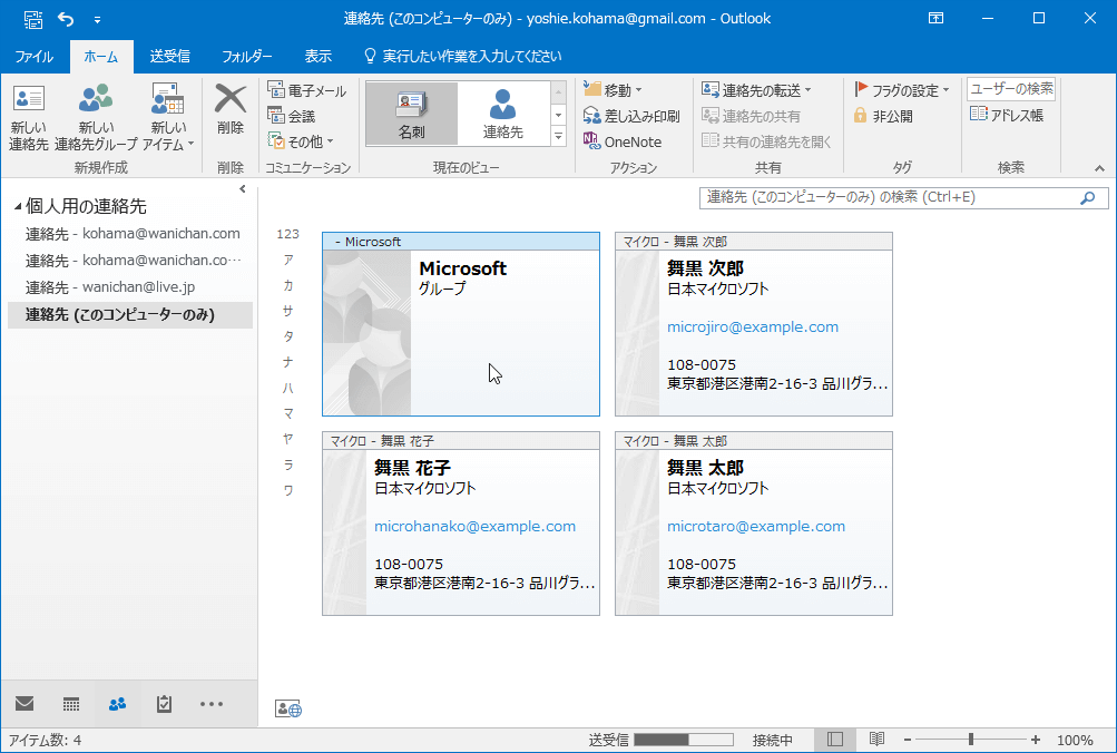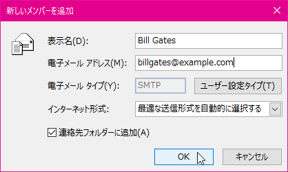 そのメンバーを連絡先に追加するには、[連絡先フォルダーに追加]にチェックを入れたままにします。もし、連絡先に追加せずグループにのみ登録するにはそのチェックを外して[OK]ボタンをクリックします。