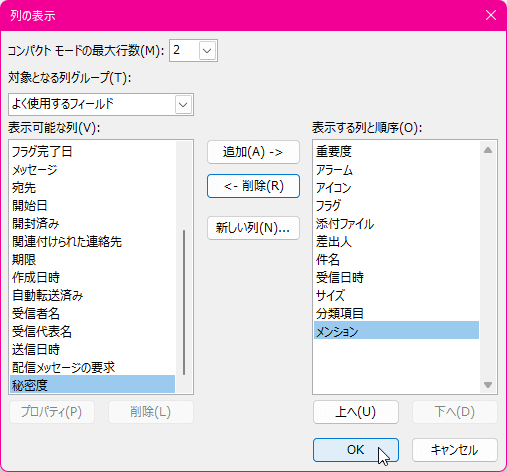 - 非表示にしたいフィールドを選択して、[削除]ボタンをクリックします。