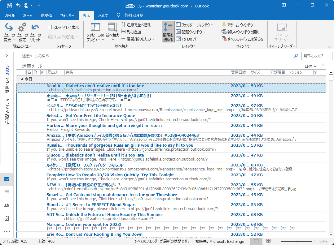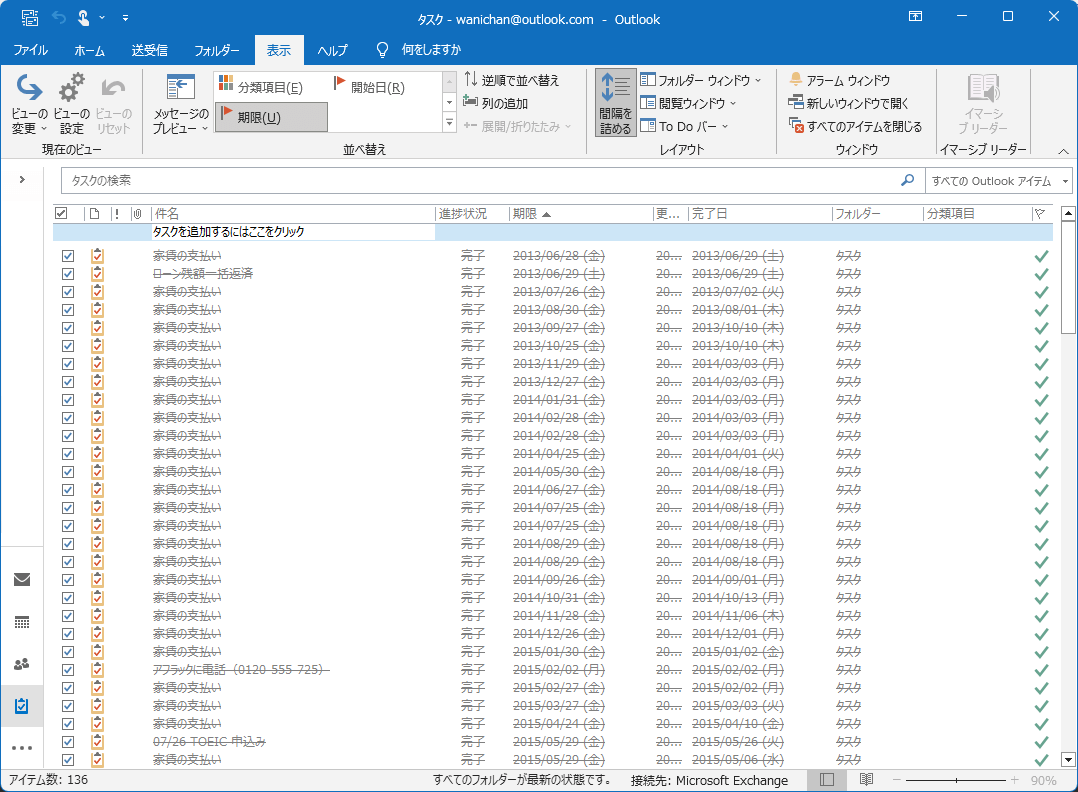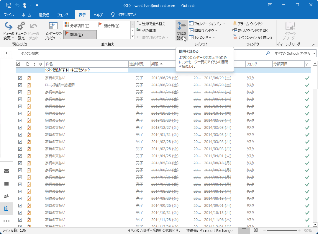 より多くのメッセージを表示するために、メッセージ一覧の間隔を狭めるには、[表示]タブを開き、[レイアウト]グループの[間隔を詰める]をクリックします。