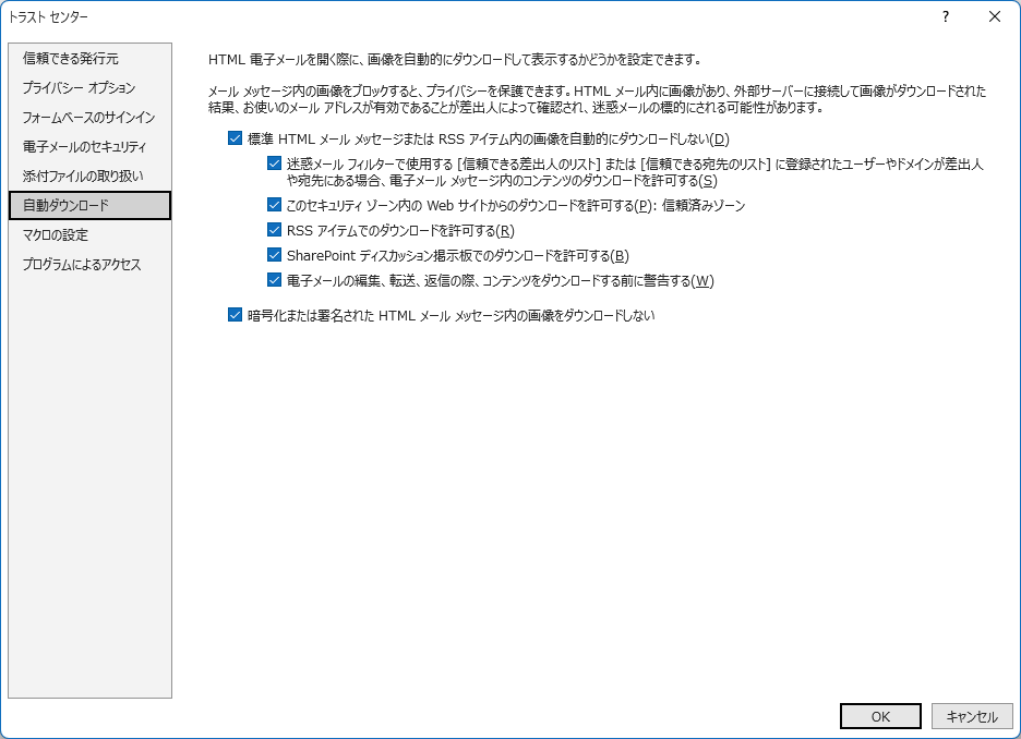 既定では、標準HTMLメールメッセージまたはRSSアイテム内の画像を自動的にダウンロードしないように設定されています。この設定はなるべくそのままが望ましいでしょう。