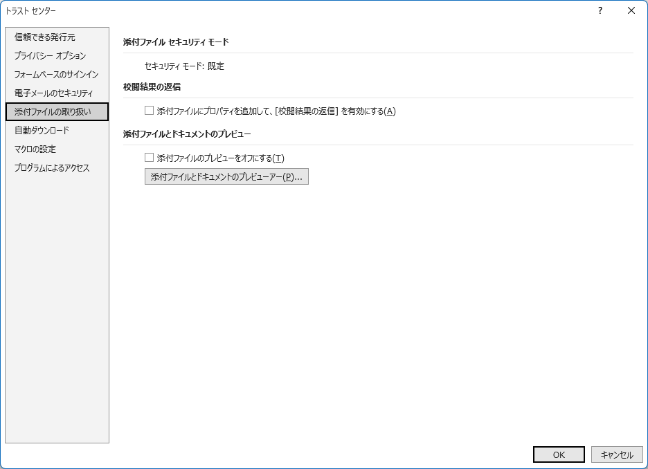 既定では、添付ファイルのプレビューはオンになっています。これをオフにするには[添付ファイルのプレビューをオフにする]のチェックを付けます。