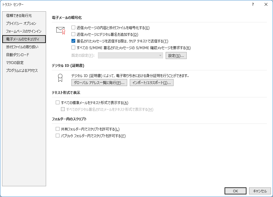 トラストセンターの[電子メールのセキュリティ]を開くと、すべてのメールをテキスト形式で送信するように設定が行えます。