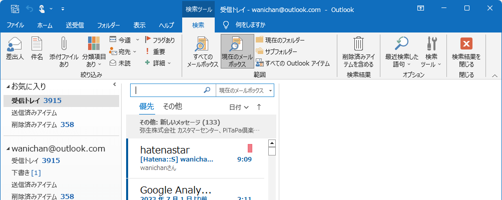 Outlookの検索ツールには、差出人、件名、添付ファイルの有無や分類項目等の条件を指定してアイテムを絞り込み検索をすることができます。