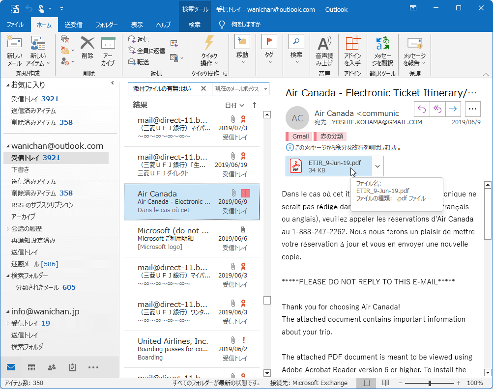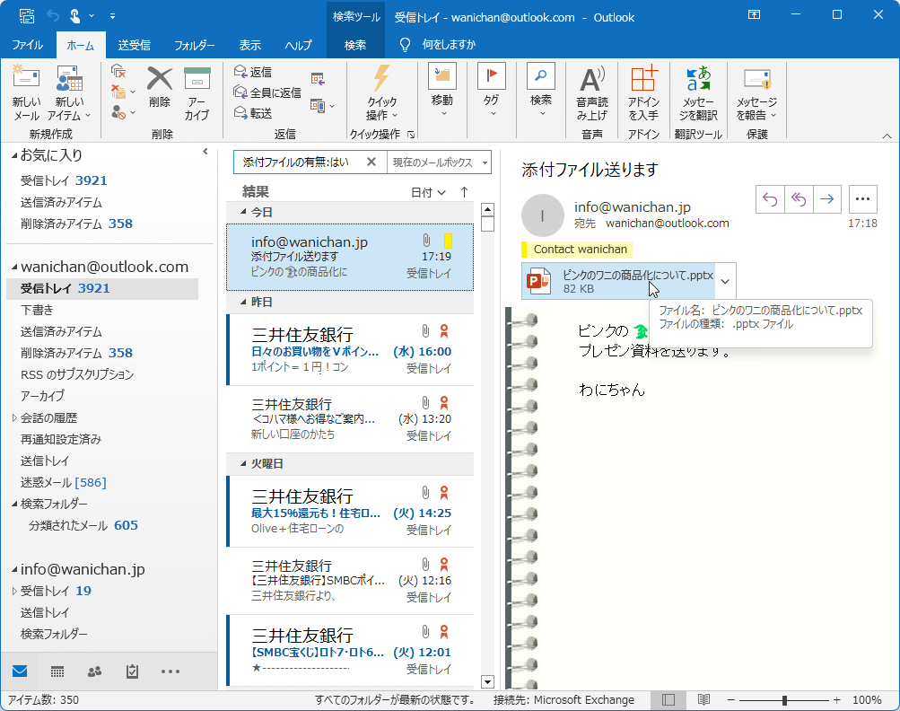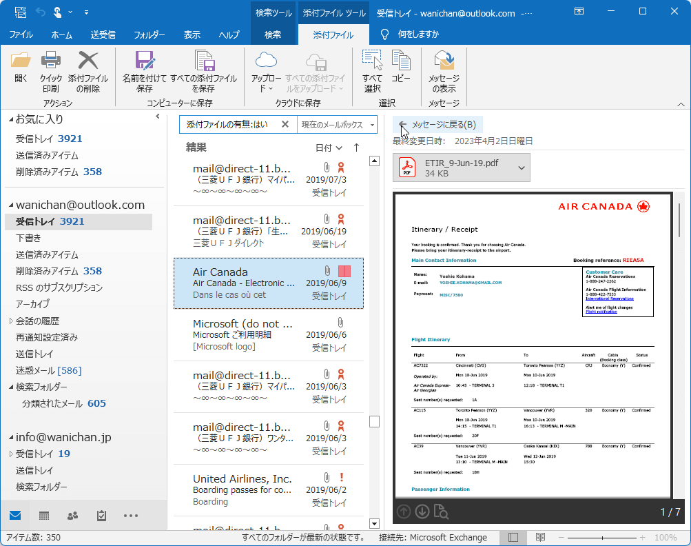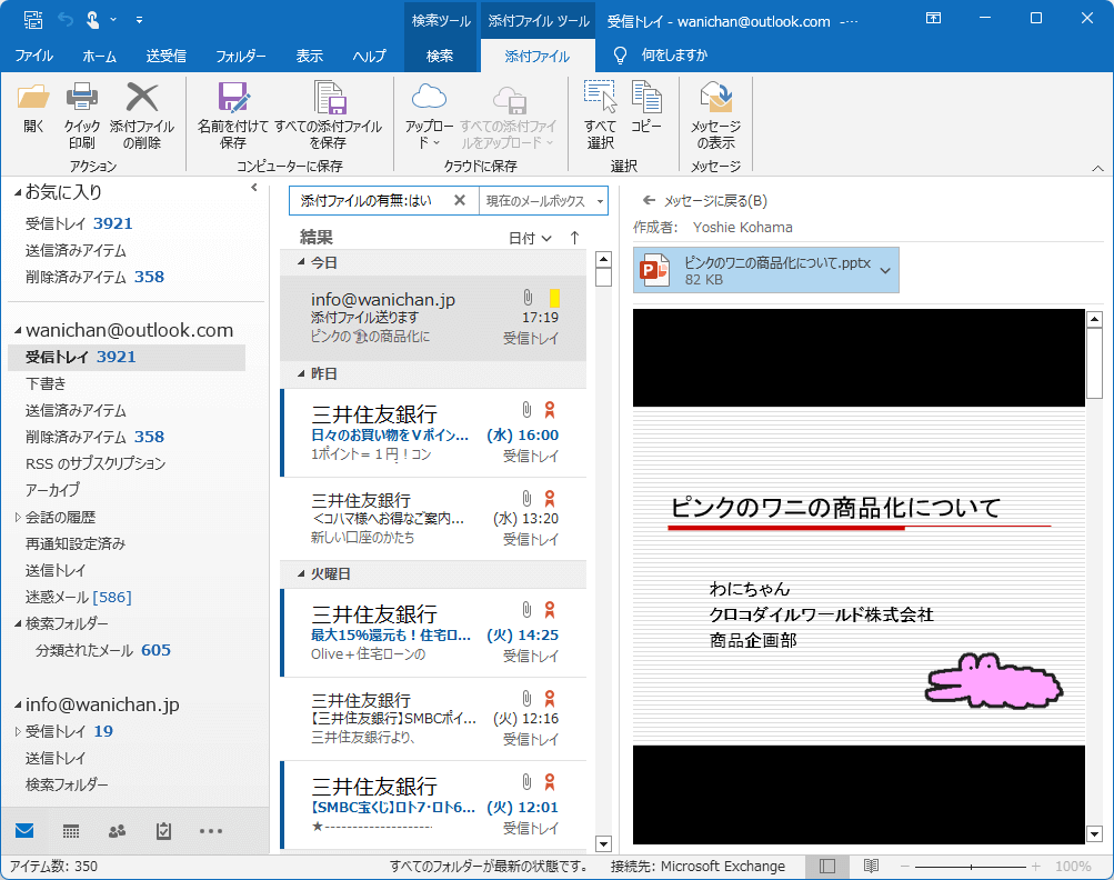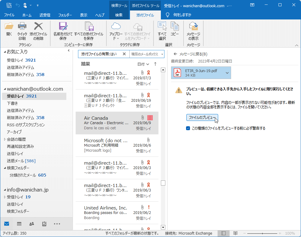 メッセージの添付ファイルをクリックするか、▼一覧から[プレビュー]を選択すると、メッセージウィンドウに添付ファイルのプレビューが表示されます。外部ファイルではプレビューをするかどうか確認メッセージが表示されるので、[ファイルのプレビュー]ボタンをクリックします。プレビューを終了するには[メッセージに戻る]をクリックするとOKです。