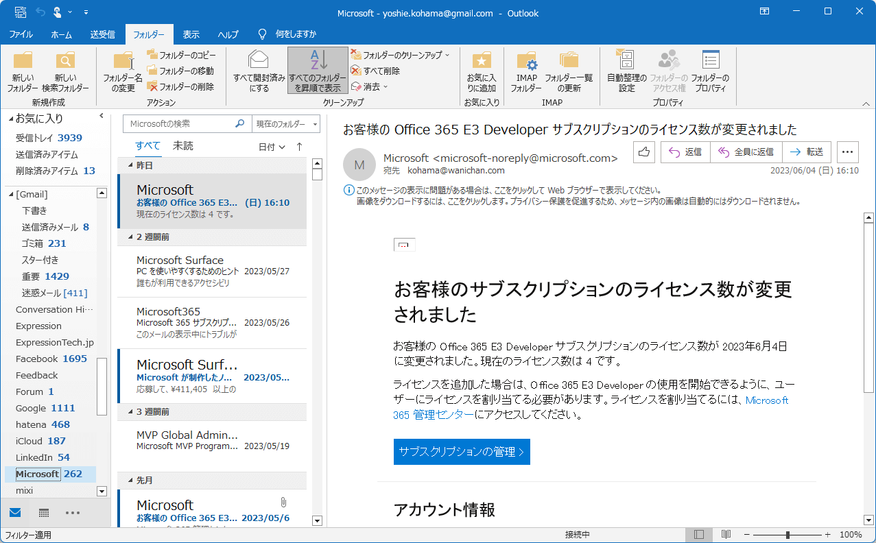 - [すべてのフォルダーを昇順で表示]ボタンがハイライトされ、フォルダーが昇順で表示されました。