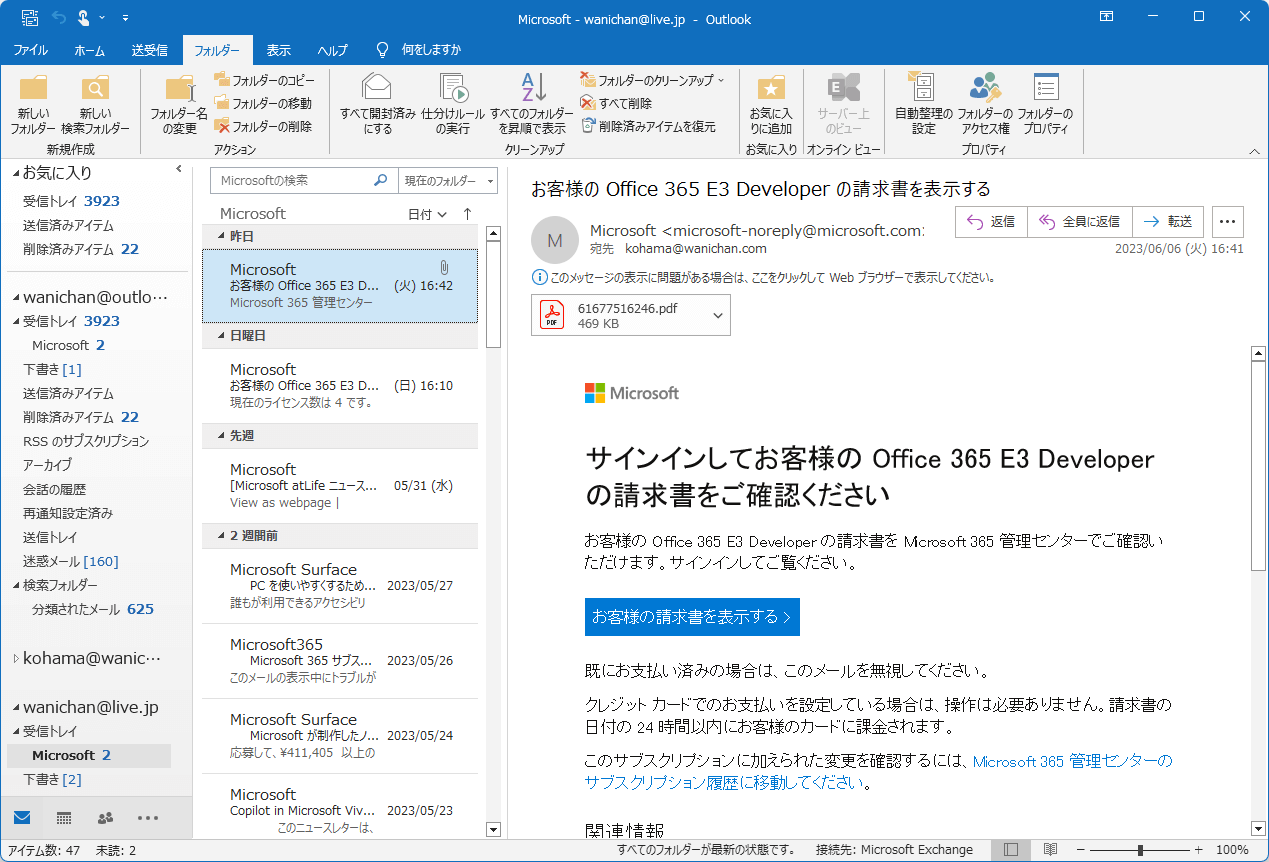 - コピーしたいフォルダーを選択して、[フォルダー]タブの[アクション]グループの[フォルダーのコピー]をクリックします。