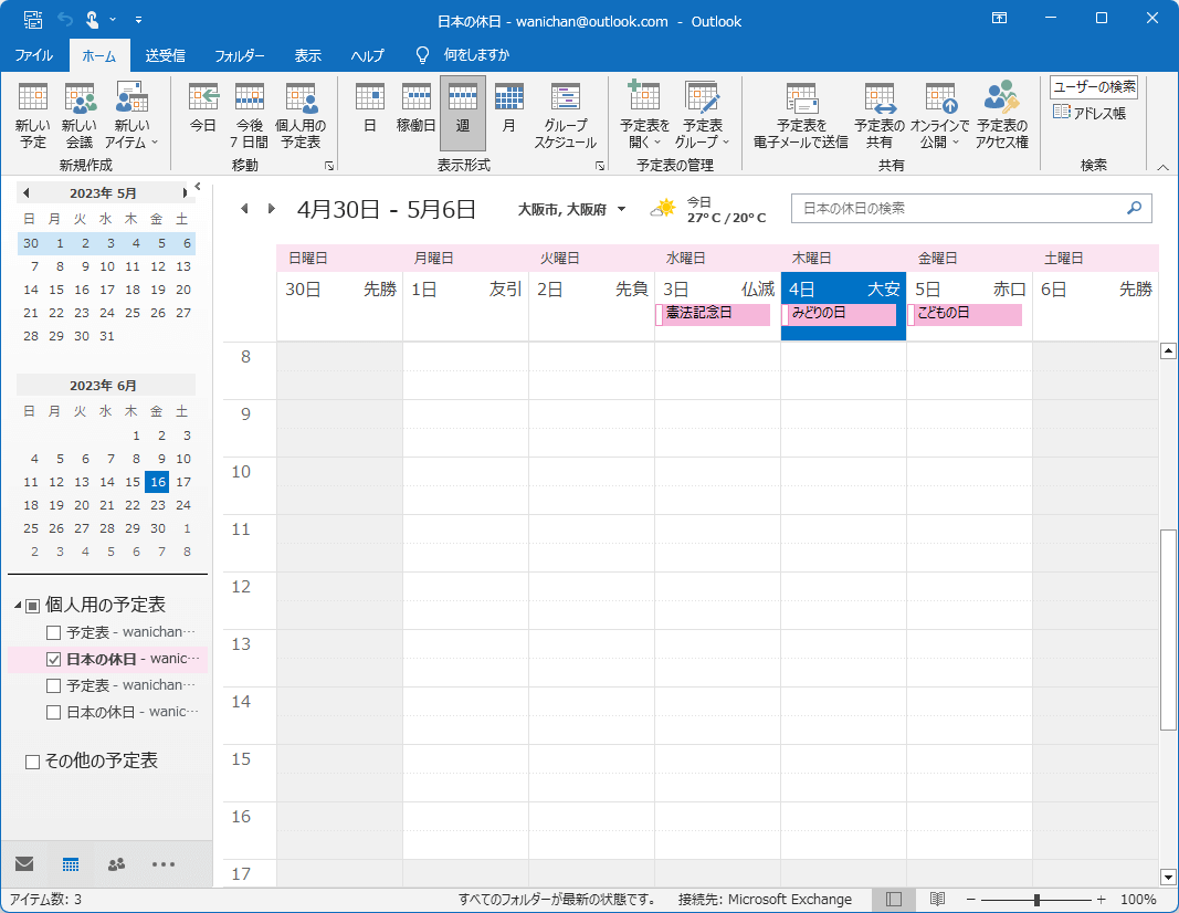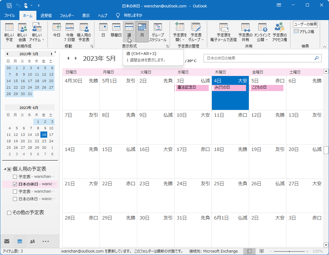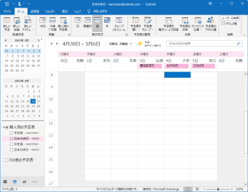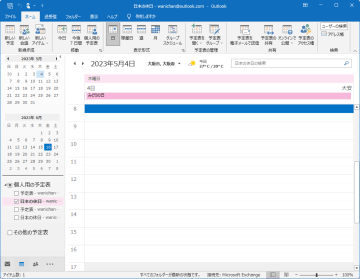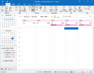 予定表の表示形式を変更するには、[ホーム]タブを開き、[表示形式]グループのなかから表示したい表示形式を選択します。Outlookに用意されている表示形式の種類は、日単位 (Ctrl+Alt+1)、週単位 (Ctrl+Alt+2)、稼働日単位 (Ctrl+Alt+3)、月単位 (Ctrl+Alt+4)、そしてグループスケジュール (Ctrl+Alt+5) の5つです。