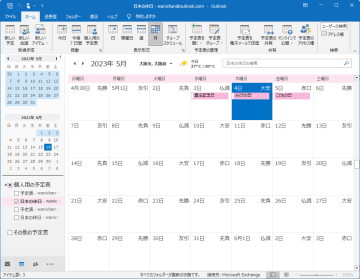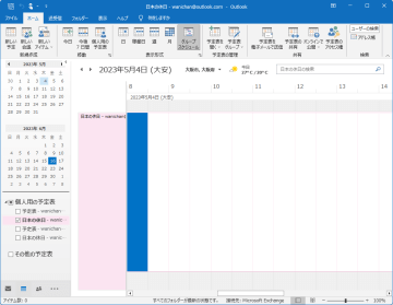 Outlook に用意されている予定表の表示形式の種類は5つあります。カレンダー形式の他に日単位、週単位、稼働日単位、そしてグループスケジュールがあります。