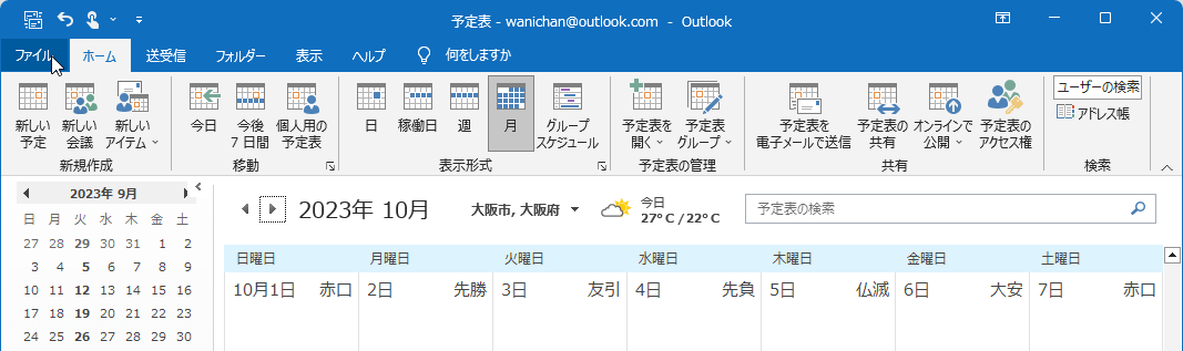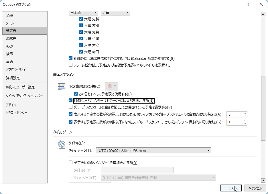 - [Outlookのオプション]ダイアログボックスの[予定表]タブを選択します。